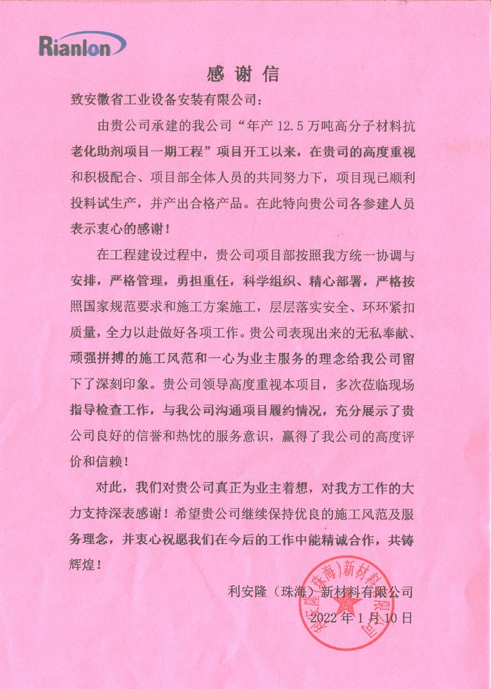 近日,利安?。ㄖ楹#┬虏牧嫌邢薰鞠虬不瞻惭b公司致感謝信,對安徽安裝公司“年產(chǎn)12.5萬噸高分子材料抗老化助劑項目一期工程”實現(xiàn)順利投產(chǎn)運(yùn)行產(chǎn)出合格產(chǎn)品表示祝賀,對項目部全體參建人員付出的艱辛努力與貢獻(xiàn)給予感謝。