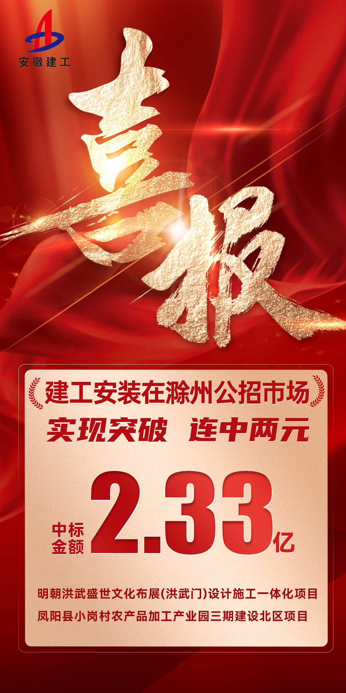近日,建工安裝連中兩標,成功攬獲明朝洪武盛世文化布展(洪武門)設(shè)計施工一體化項目以及鳳陽縣小崗村農(nóng)產(chǎn)品加工產(chǎn)業(yè)園三期建設(shè)北區(qū)項目,中標金額2.33億元,在滁州屬地市場實現(xiàn)新突破。